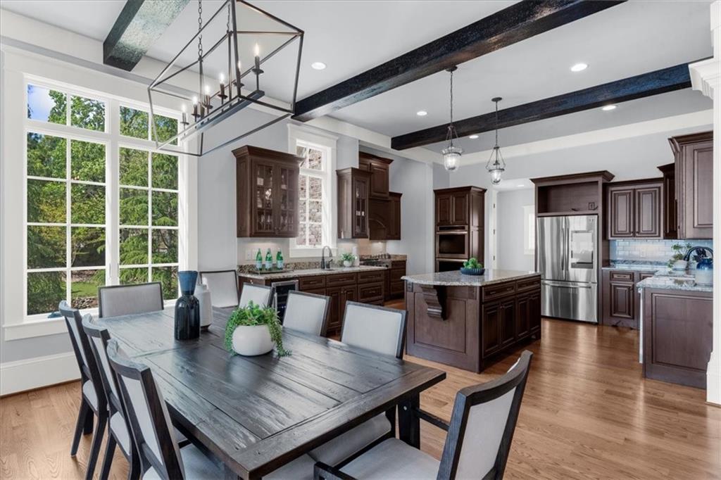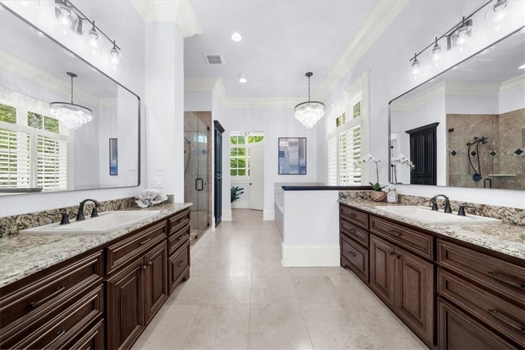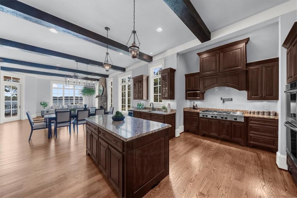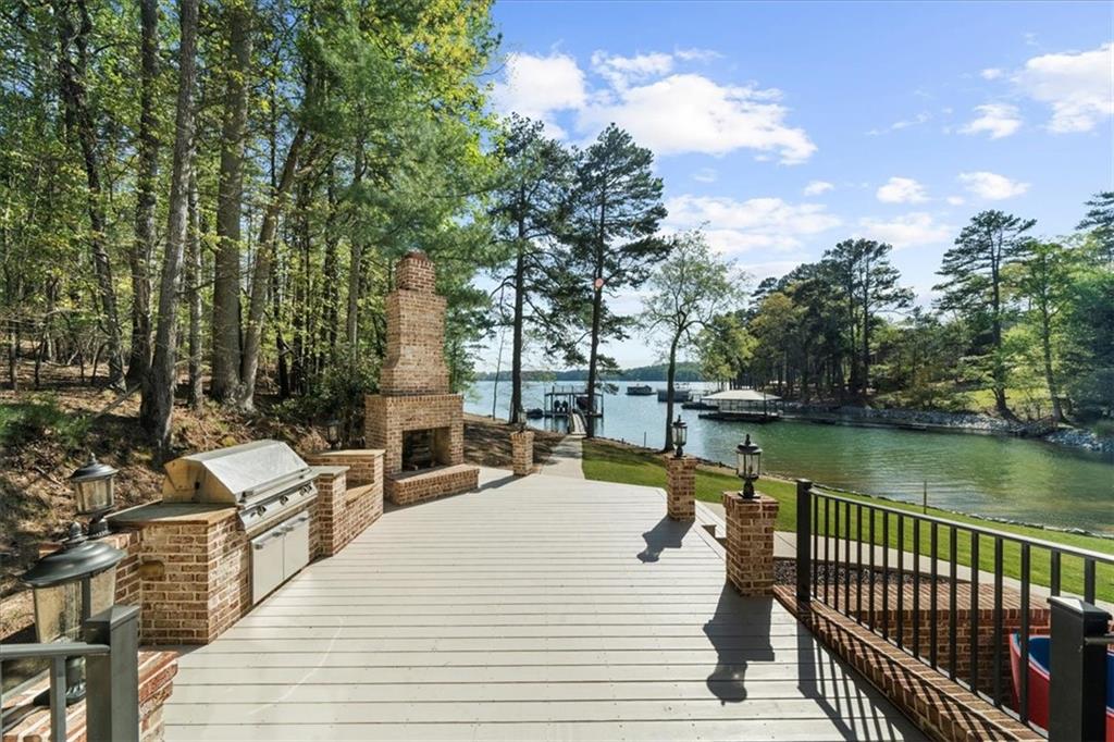 Nestled in a beautiful cove with stunning sunset views and surrounded by nature, welcome home to the best kept secret of comfort and peaceful living on Lake Lanier with TWO double-slip dock permits. Step into a realm of luxury with this magnificent custom-built estate situated on 1.1 acres in a community of multi-million-dollar homes. The 4-sided brick home offers timeless elegance and unparalleled lakefront living. From the moment you arrive, the home's striking curb appeal, manicured grounds and a climate-controlled 3-car garage, sets the tone for what lies within. Inside, every detail has been thoughtfully curated to combine luxury with comfort. Beamed and coffered ceilings, intricate trim work, and rich hardwood floors guide you through an architectural marvel that is as beautiful as it is functional. The heart of the home, a gourmet kitchen, with its top-tier appliances and ample workspace has room for all of the chefs in your family to prepare amazing meals. The kitchen flows into a sunlit, banquet-sized breakfast area and a cozy keeping room with one of the home's multiple stacked-stone fireplaces. Nearby, the great room, with its own fireplace surrounded by custom built-ins and French doors, opens to an expansive covered deck with sweeping 4-season lake views. This home offers two luxurious owner's suites, one on the main level and an oversized retreat upstairs. Each features a spa-like ensuite bathroom. The generously sized secondary bedrooms all have private baths and lake views, ensuring privacy and relaxation for every guest. Downstairs, the terrace level transforms into an entertainer's paradise. A full kitchen, large entertaining and dining spaces, a home gym, and a versatile bonus room make it ideal for gatherings. Step outside to discover an outdoor oasis where a fireplace, grill station, and hot tub set the stage for unforgettable evenings. The property's crown jewel...two private docks in deep water! Completing this spectacular property is a detached studio space above the garage, complete with a kitchenette, full bathroom, and additional laundry room--perfect for guests or a separate home office. Ideally located minutes from vibrant lakefront dining, marinas, and shopping, this estate is also convenient to I-985, granting easy access to Atlanta's cultural attractions or the serene beauty of North Georgia's wineries and hiking trails. This is not just a home; it's a lifestyle. Experience lakefront luxury at its finest--schedule your private showing today.
